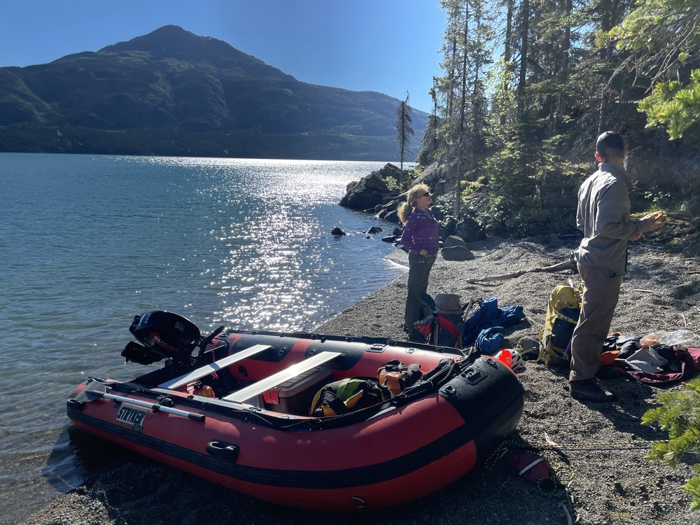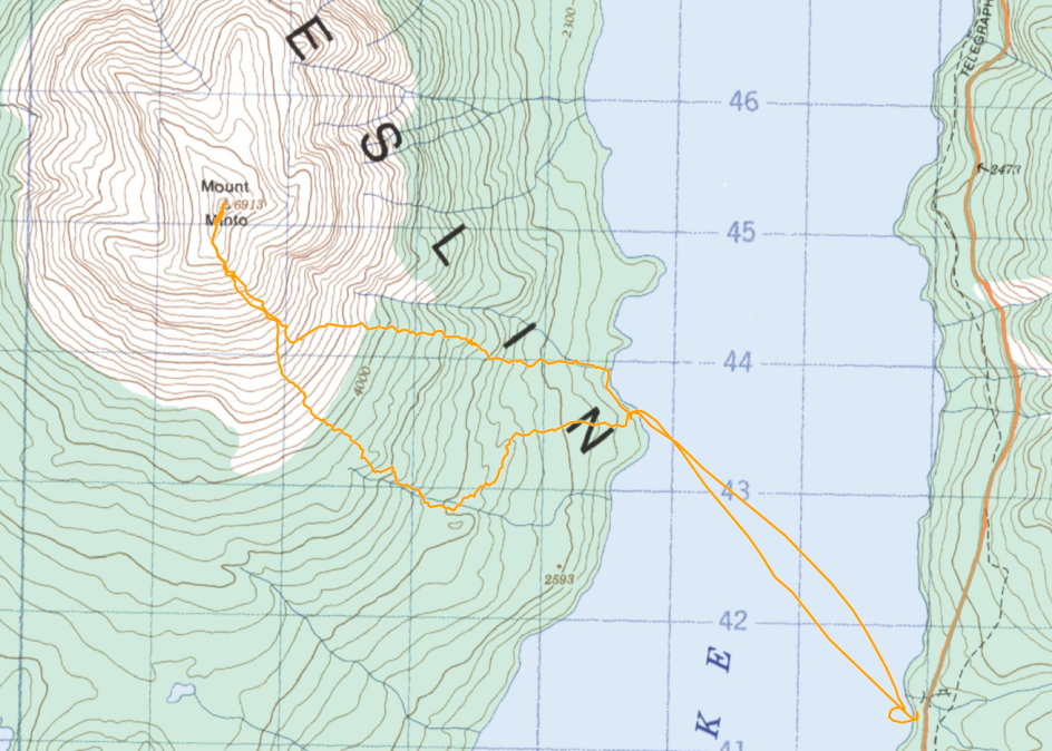 Our epic one day push to hike the mountain in late June 2021, started out with a calm crossing of Atlin Lake in the morning. We started from the boat launch (more of just a path to the lake) at a recreation site about 15 km from the north end of Atlin Lake. We aimed for a sheltered beach to tie the boat up, and figured we would just start hiking from there.