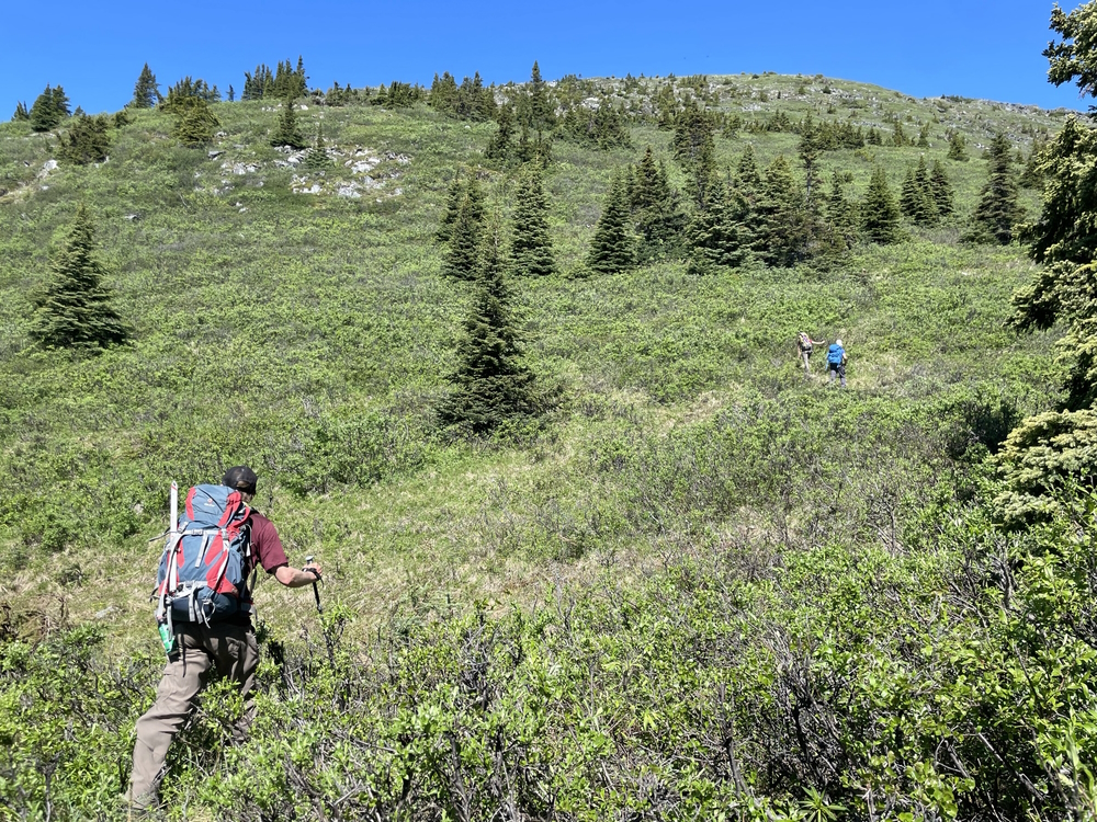 We abruptly popped out of the forest and the treeline was now mostly behind us. In front of us was a steep slope filled with chest-high brush. The brush was a nice relief from the thick forest, but it was still a challenge to hike up through it.