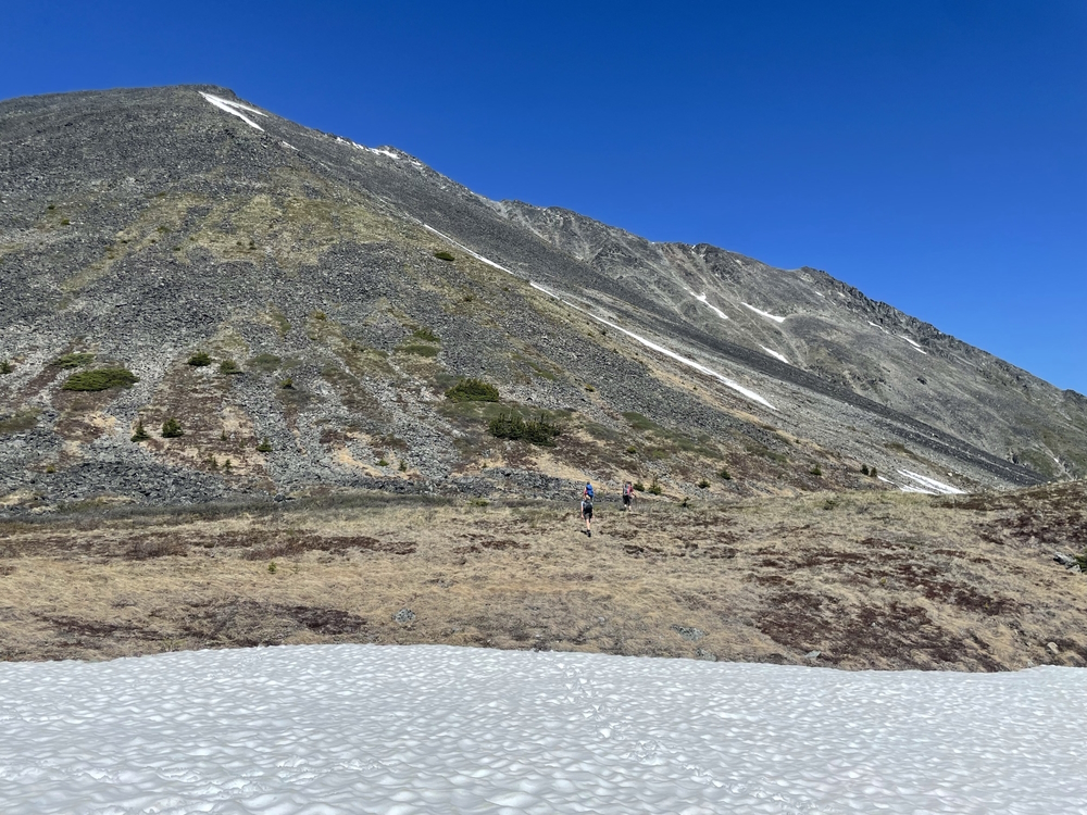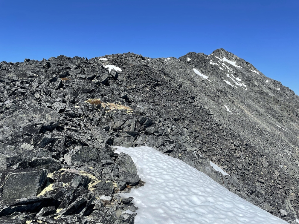 Above us was now rock, all the way to the summit. We slowly climbed up the rocky slope, sometimes using snow to change up the monotony of hiking up rocks. Halfway up the rocky slope was a small grassy patch where we had lunch.