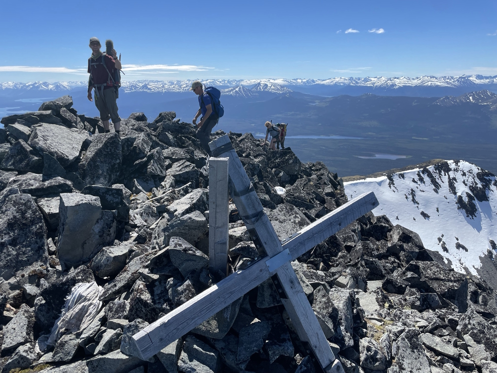 Reaching the summit, we found a large wooden cross and a summit log book. The views were astonishing. Atlin Lake, Little Atlin Lake, Tagish Lake, Tutshi Lake and Teslin Lake were all visible from the summit.