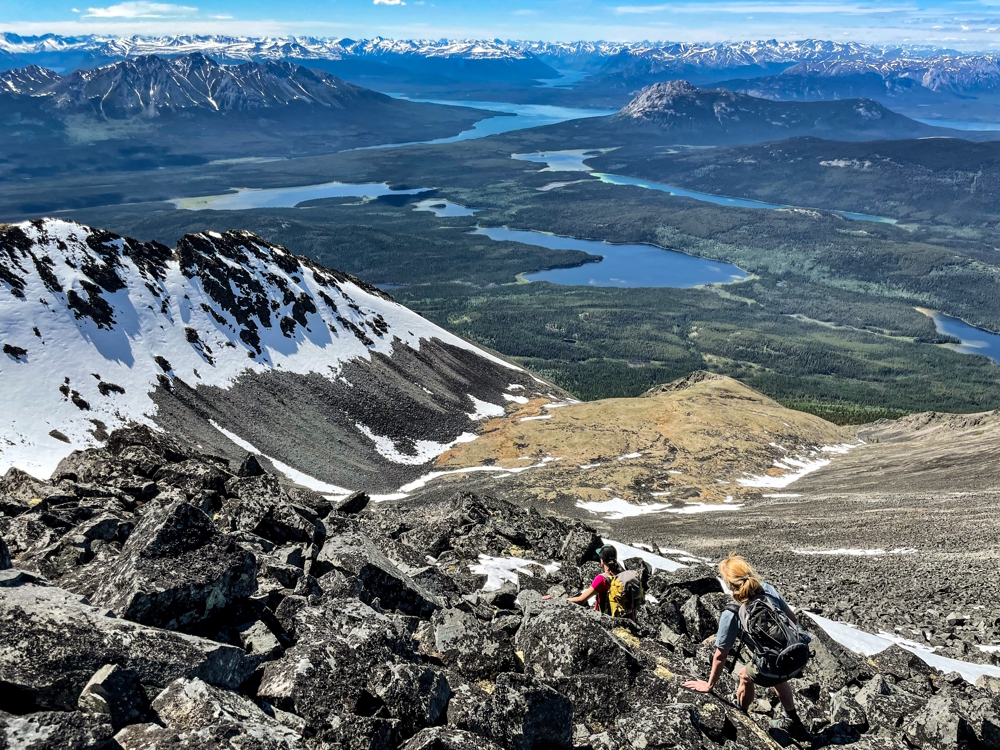 Scrambling back down from the summit. Views of Tagish and Tutshi lakes in the distance, looking to the west.