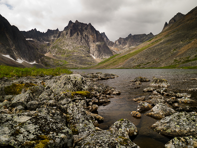 The trail drops down to a large meadow, and then continues along the side of the ridge. Once you turn the corner, you will start to slowly lose elevation but gain beautiful views of Grizzly Lake and the rocky peaks surrounding it, with Mount Monolith in the background. Once down in the valley bottom continue following the trail to the campground, crossing a small stream just before reaching the first few tent sites. The campground has ten tent pads, a cooking shelter, a grey water barrel, bear proof lockers and an outhouse. If you are camping at the lake you will need to register and pick up a permit from the Tombstone Park Interpretive Centre. Registration can be done online through the parks website or in person at the centre.