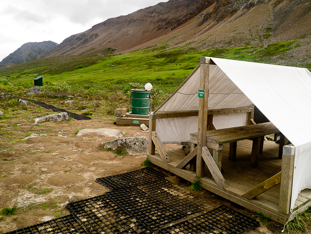 The campsite facilities - cooking shelter, bear cache, outhouse, and grey water barrel.