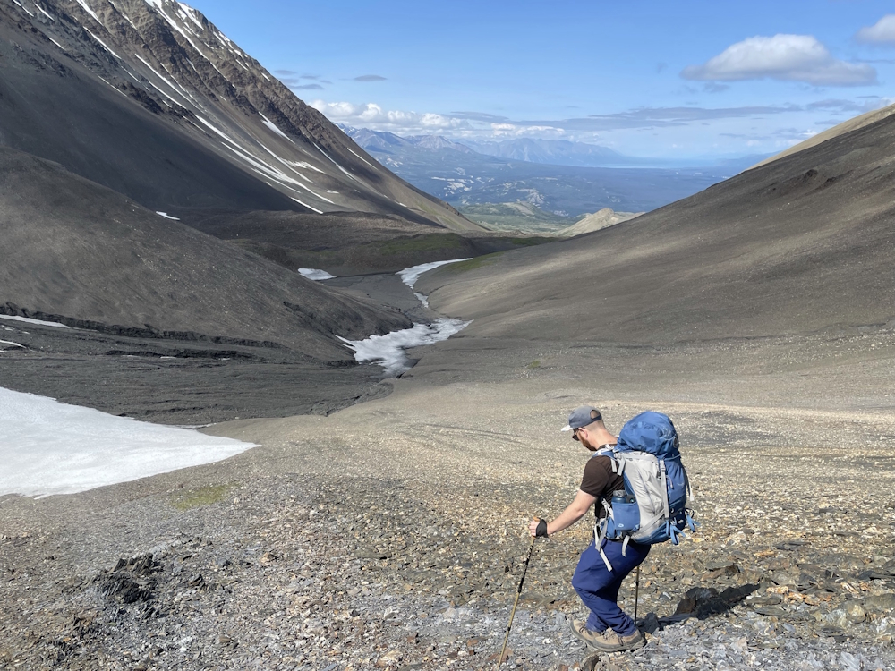 The other side of the saddle is also a gentle descent, where you will be dropping down 500 m in elevation. You will follow along the right side of the rock glacier. Late snow patches make the walking easier, otherwise you will be hiking down a mixture of various sized rocks, which is safe but tedious. Continue down alongside the rock glacier until you reach its toe (the end of the glacier).