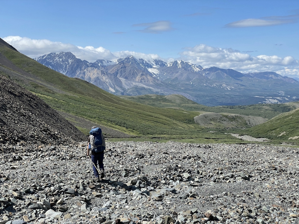 Descending the other side of the saddle. The rock moraine is on the left.