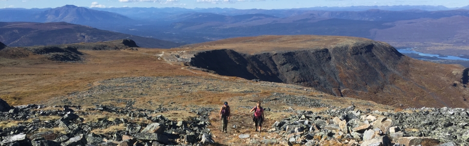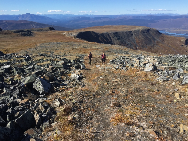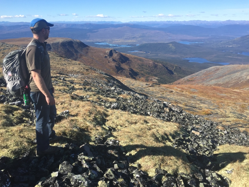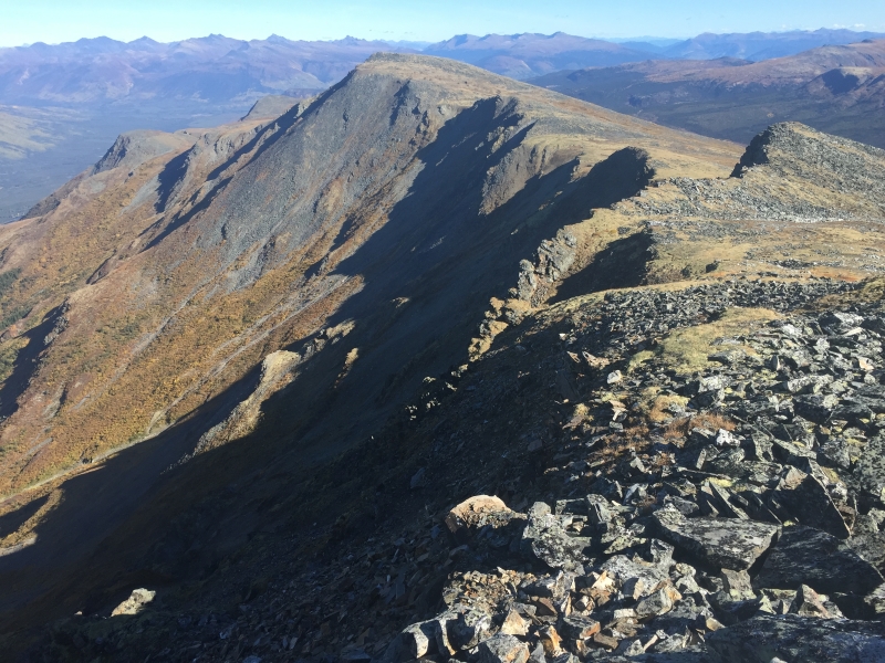 From the parking area, follow the road that continues to the east for 100 m then leave the road and head south across the alpine tundra towards some small rocky ridges. Follow the ridges east, and find an easy route up the rocky talus to the highest rocky ridge (marked by a cairn and a claims post on top). From here you can get a great view down over Keno City and south towards the Mount Hinton area. This little side trip is only 1 km from the parking area.