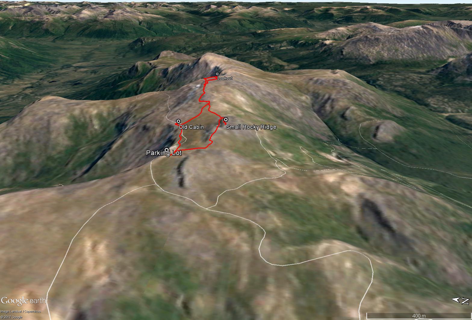From the lookout, you can return back down the way you came up Monument Hill and then stay on the north side of the ridge heading west towards the old cabin (Sheep Camp, circa 1920s). Along the way you get great views now to the north, over a wide expansive valley dotted with lakes, including Gambler Lake, Hanson Lakes, and Ladue Lake. After checking out the cabin, pick up the old mining road that takes you back to the parking lot.