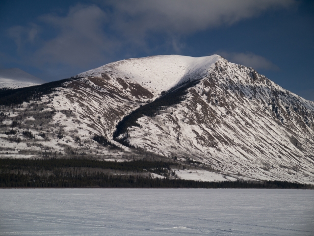 The view of Nares Mountain from Carcross. The route described follows the left ridge to the summit.