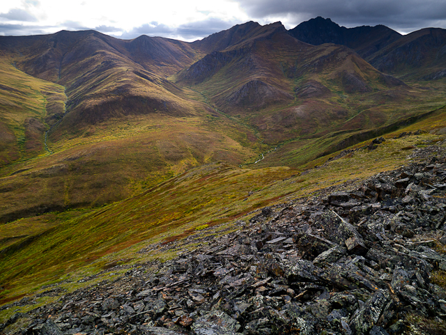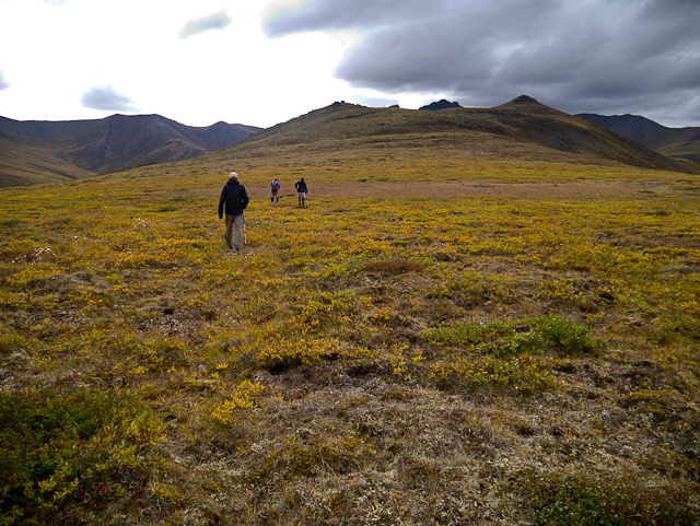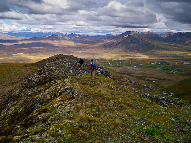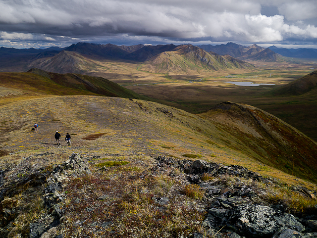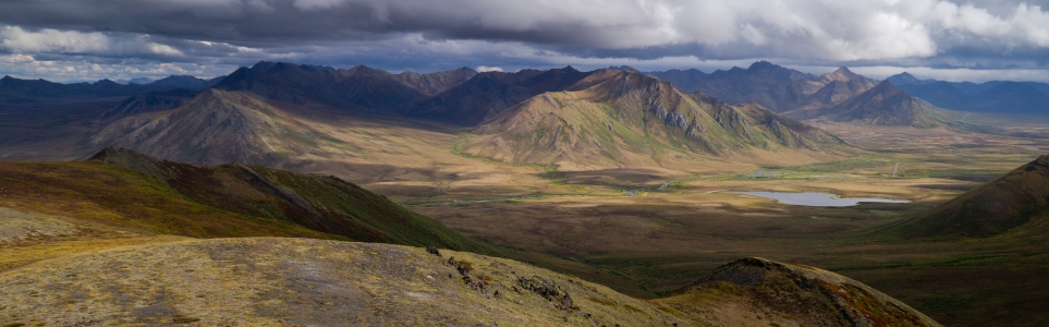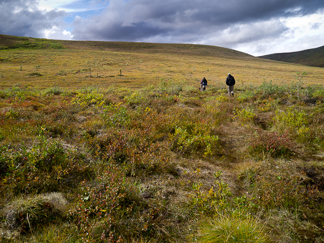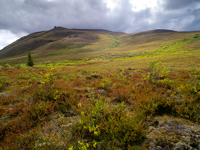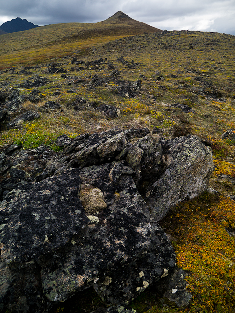 A nice tundra hike in the northern part of Tombstone Park in the Blackstone Range. The view includes the wide open valley of the Blackstone River as it meanders north and the surrounding rolling hills which give way to more dramatic mountain ranges beyond.