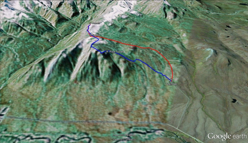 You can return the way you came up, but it is also nice to head back along the ridge and continue northeast towards the other end of the mountain and descend towards a rock pillar on the northeast facing slope. There are beautiful views looking north over the Blackstone River and the mountain ranges beyond. The slope is gentle and spongy making for a nice descent. You will need to cross a few small streams and willow sections to get back to the parking area, but it is easy to find animal trails to avoid the bushwhacking.