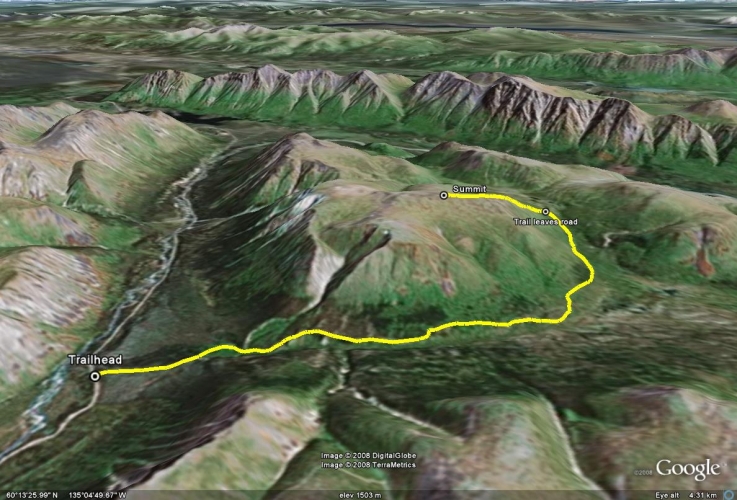 Hiked up July 26. Seems the trail has been taken out by a slide? It was a scramble to get up it and we did not take the suggested round about route. Instead tackled it face on and it certainly cuts off time. Explored a couple of the peaks overlooking the Weaton River valley, the mountains just go on forever! The decent was a quick steep one coming down the front face along caribou trails. Worked out to just over 8km and 5 hours without exploration of the top included. Highly recommended thigh burner!