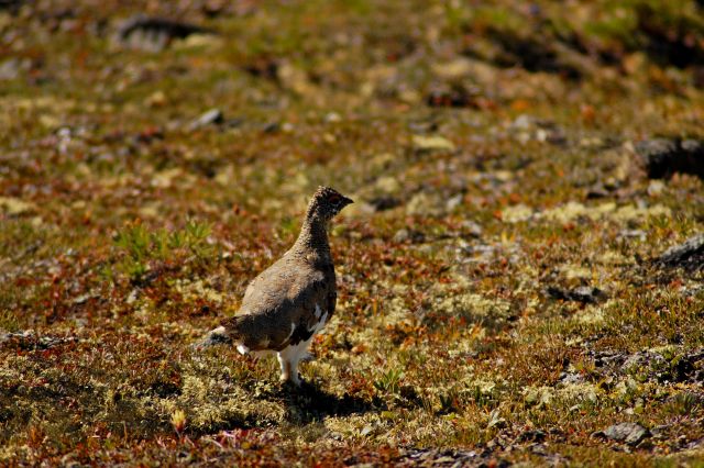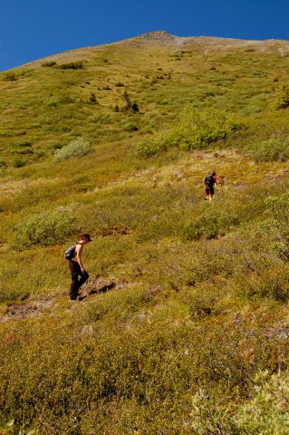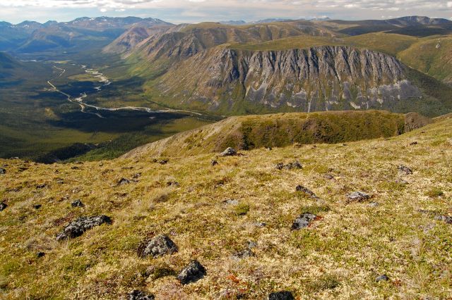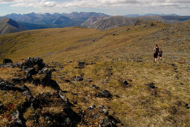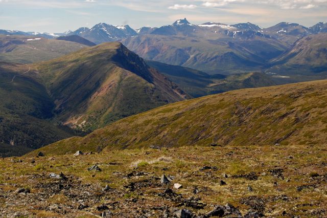 After a total of about 8 km (from the trailhead) you will leave the road and turn left, straight up the steep ridge. There is no trail to the top from here, but it is mostly alpine so you can pick your own way up. You will reach a high plateau with great views once at the top. Continue following the ridge to the summit. Watch out for caribou, hidden behind the rocks! Return the way you came up. Alternatively, instead of hiking the slope directly up the mountain, you could follow the road the longer way around, keeping left at any forks in the road.
