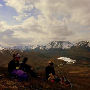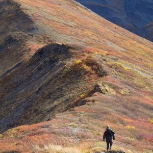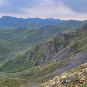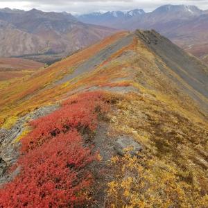 We actually went up on Charcoal Ridge twice during our stay in Tombstone in June 2019 - that is how amazing it is from the ridge. The views are stunning in all directions. The wind can get very strong as you gain elevation. Watch for a small cairn off the side of the highway about 100m south of the "72" km highway marker. Follow the trail down to the creek. Go upstream a few meters until you see a 2x6 laid across the creek. Cross there and keep going straight and slightly left towards the little ridge. There you will see a fairly overgrown track going up the ridge. It was not easy to find the first time. Follow this track all the way up to the ridge and keep going and going. Watch for bears along the creek. We saw some nice prints in the mud!