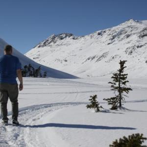 Fraser Lake is a popular winter recreation area as well. It is an easy ski or snowshoe in to the lake with a well packed route thanks to the many snowmobiliers. Follow the same route as the summer, described above. Being so close to the highway it is a good introductory winter camping destination as well as avalanche training area. There is lots of simple terrain to navigate as well as more complex and challenging terrain.