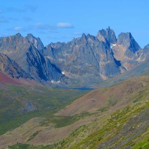 The trail drops down to a large meadow, and then continues along the side of the ridge. Once you turn the corner, you will start to slowly lose elevation but gain beautiful views of Grizzly Lake and the rocky peaks surrounding it, with Mount Monolith in the background. Once down in the valley bottom continue following the trail to the campground, crossing a small stream just before reaching the first few tent sites. The campground has ten tent pads, a cooking shelter, a grey water barrel, bear proof lockers and an outhouse. If you are camping at the lake you will need to register and pick up a permit from the Tombstone Park Interpretive Centre. Registration can be done online through the parks website or in person at the centre.