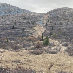 Named after the creek that flows below the ridge, Jackson Ridge (not an official name) is an easy hike close to Whitehorse. There is no real bushwhacking and the ridge has panoramic views from the Fish Lake area to the Ibex Valley. There are also some impressive rocky ledges and cliffs on the other side of the ridge (SW side). A mountain bike is a great way to shave off 2.5 km of the hike (each way), as the first section is on mostly flat dirt road. The hike is about 2 hours with a bike, and up to 4 hours by simply hiking the whole route.