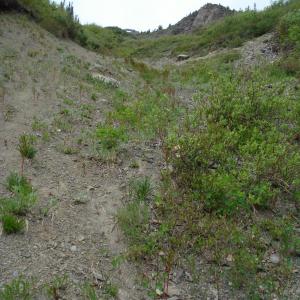 Looking up the avalanche path from the highway.