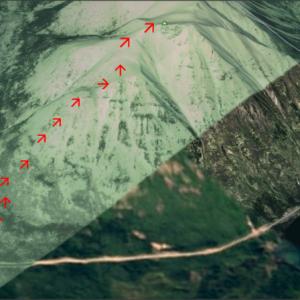 This route follows the avalanche path up to the summit. The first part of the route requires some bushwhacking up through the base of the avalanche path. The bushwhacking takes about 45 minutes and is not very pleasant. Most of the vegetation is willow and high-bush cranberry, and this route may be something to avoid during berry season, so as not to run into foraging bears.