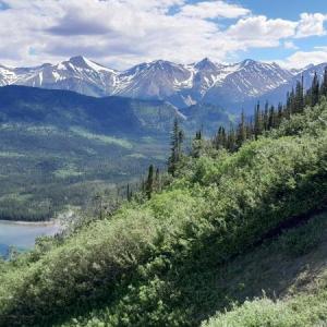 Mount Racine is a prominent peak at the south end of Tagish Lake's Windy Arm with sweeping views also over to Tutshi Lake and the surrounding mountains. The route is a direct one, straight up the main avalanche path, which is the quickest way to the top and also avoids the most bushwacking.