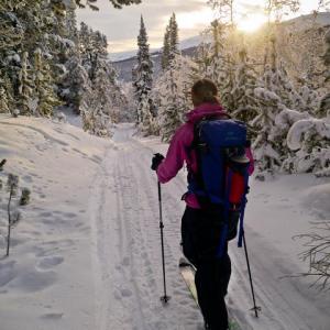 We had a great ski tour up the Tally-Ho road on the weekend. The Annie Lake road is plowed all the way to the parking area. Snowmobiles have packed the trail up to the just before tree-line. In the alpine, the snow has a hard slab on top of sugary snow, which makes trail breaking a little difficult.