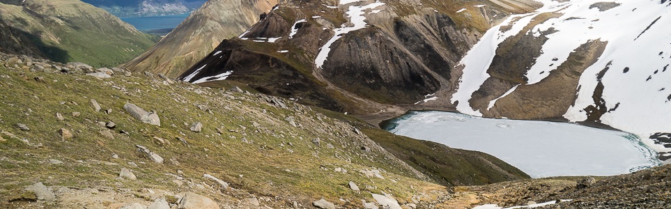The other recommended side trip is to the west of Bock's Lake, up to a saddle that has a sweeping view of the Duke River and deep into the Kluane Icefields. It is about a 6 km return trip from Bock's Lake and gets to an elevation of 2,348 m. Hike west from the lake, and try to get up on the vegetated areas as they are easier to walk on than the rocky moraines. Climb up the hills and then aim for the base of the ridge in front of you that angles up towards the mountain on your left. You can hike this ridge to the top of the saddle. There is a small snowfield on the other side of the ridge.