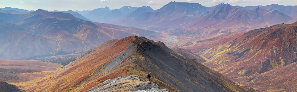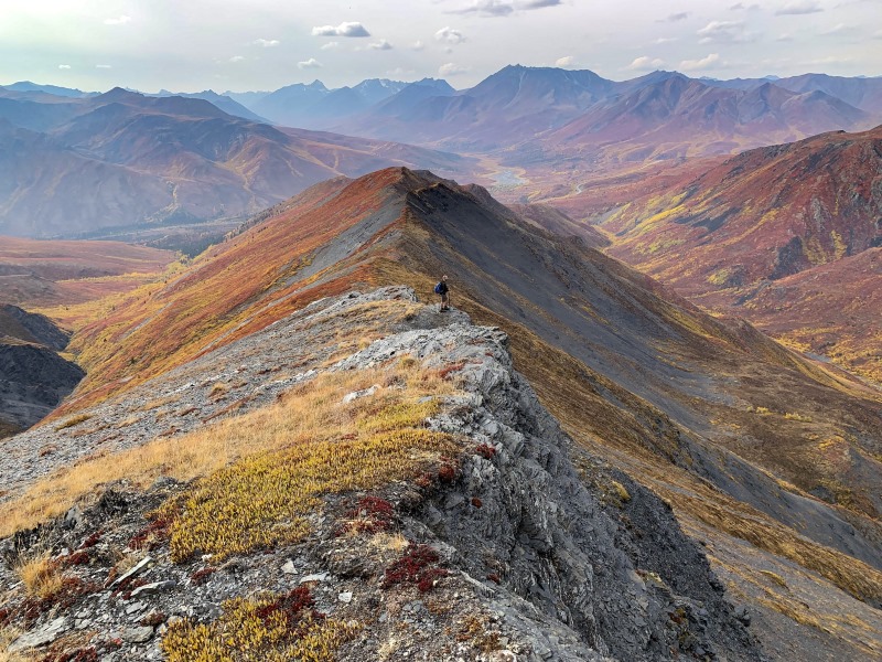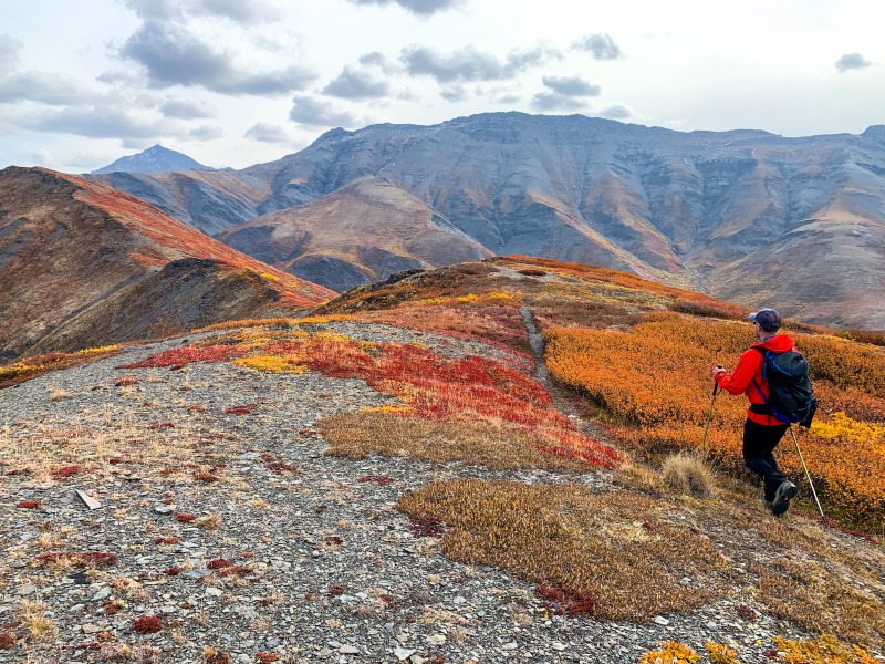 We actually went up on Charcoal Ridge twice during our stay in Tombstone in June 2019 - that is how amazing it is from the ridge. The views are stunning in all directions. The wind can get very strong as you gain elevation. Watch for a small cairn off the side of the highway about 100m south of the "72" km highway marker. Follow the trail down to the creek. Go upstream a few meters until you see a 2x6 laid across the creek. Cross there and keep going straight and slightly left towards the little ridge. There you will see a fairly overgrown track going up the ridge. It was not easy to find the first time. Follow this track all the way up to the ridge and keep going and going. Watch for bears along the creek. We saw some nice prints in the mud!