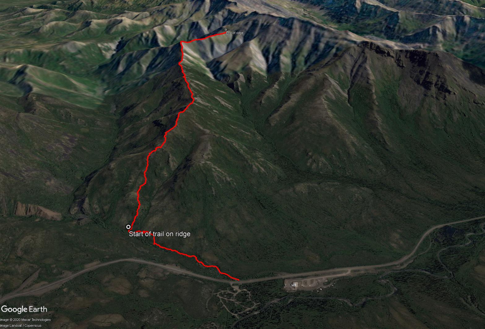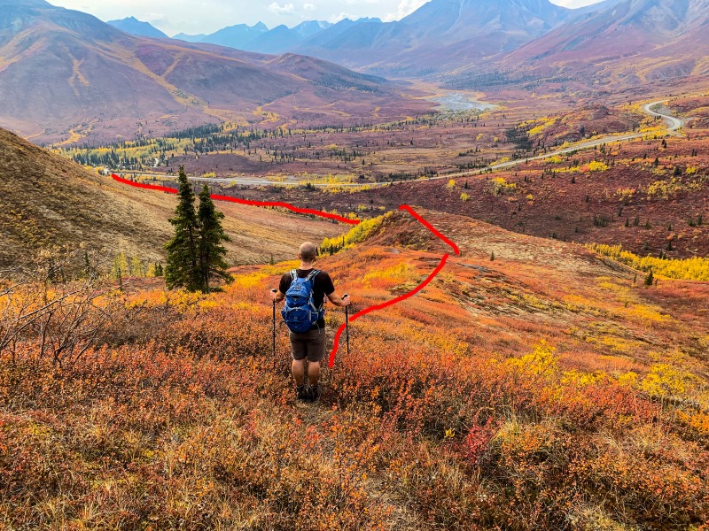 Looking down the gradual ridge back towards the Tombstone campsite. The red line follows along the creek until reaching the base of the gradual ridge.