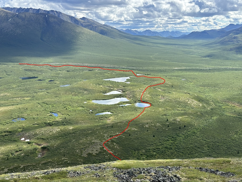 Looking back towards the highway from on top of the ridge. Approximate route marked in red.