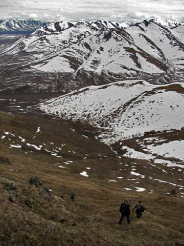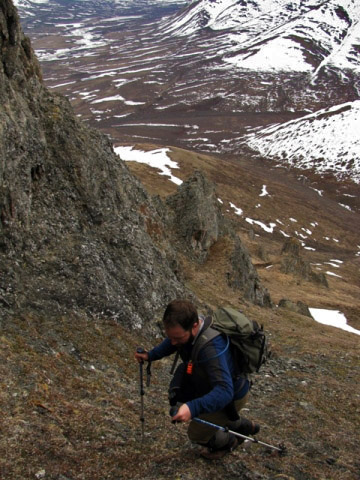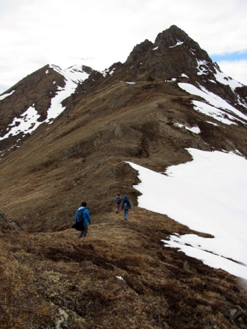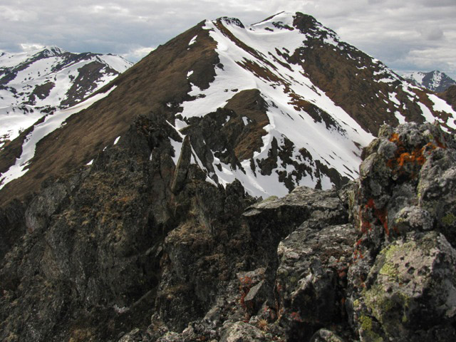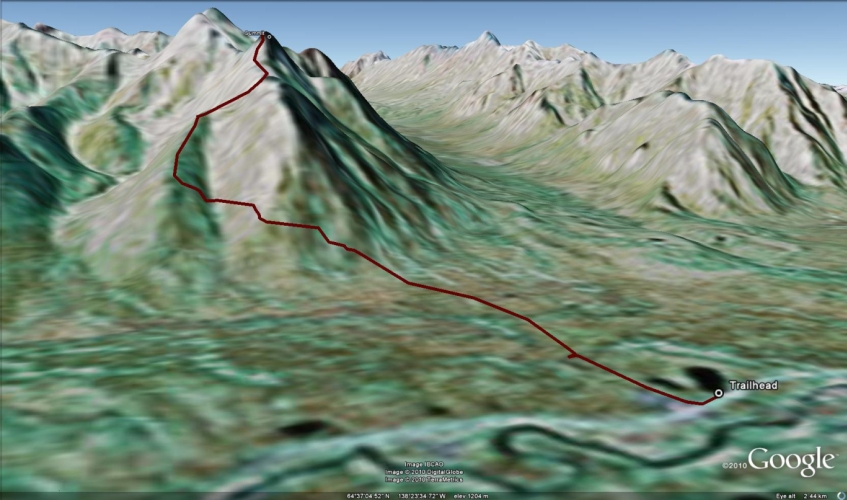 This was a great hike. A colleague and I made it to the forward peak before the summit. Note that there is no identifiable trail other than elk trails leading in all directions, and to follow the GPS track, you must bushwhack (tundra-whack if you will) your way up to the edge of the greenery. At first I attempted to follow the GPS track while attempting to find a trail. After making it up 1/3 of the way of the East face I headed south towards the shallow valley and found a relatively smooth path to the south of the river bed. Once near the top of the stream bed I headed straight up the relatively flat face to the suggested summit which was relatively easy going. There were many burrows of what was likely the collared pika (Ochotona collaris). Since we were on the move to avoid looming dark clouds we didn't take the chance to stop and watch for pikas but their characteristic startled chirp could frequently be heard as we rounded each bend. Initially we followed the given GPS track up the north edge of the slope, and the many tufts of grass made it hard going. On our return we took our reversed path down the southern slope and then followed the valley river bed. Once the brush got heavy, we took a beeline for the gravel pit (trailhead) where we parked. It was much smoother surface, easier going and drier. Attached photo is our route superimposed over the track offered on this website: http://www.yukonhiking.ca/mount_adney.html.