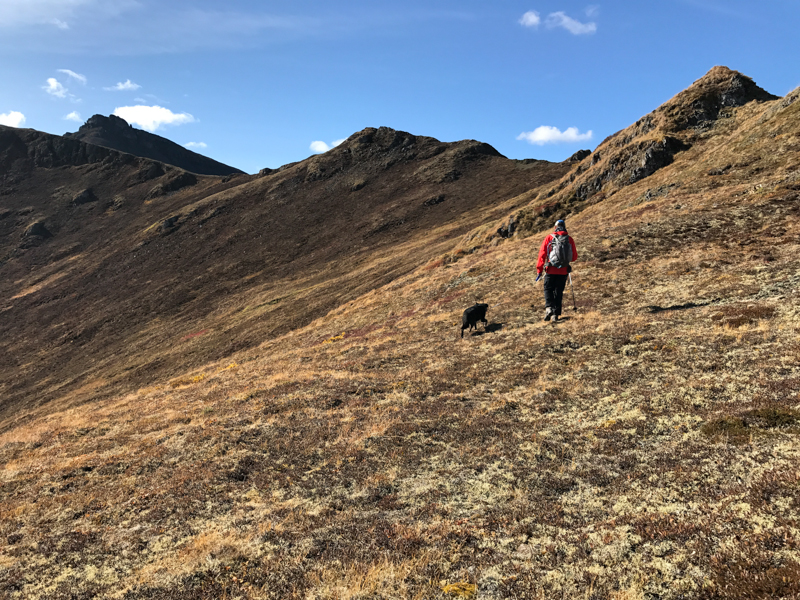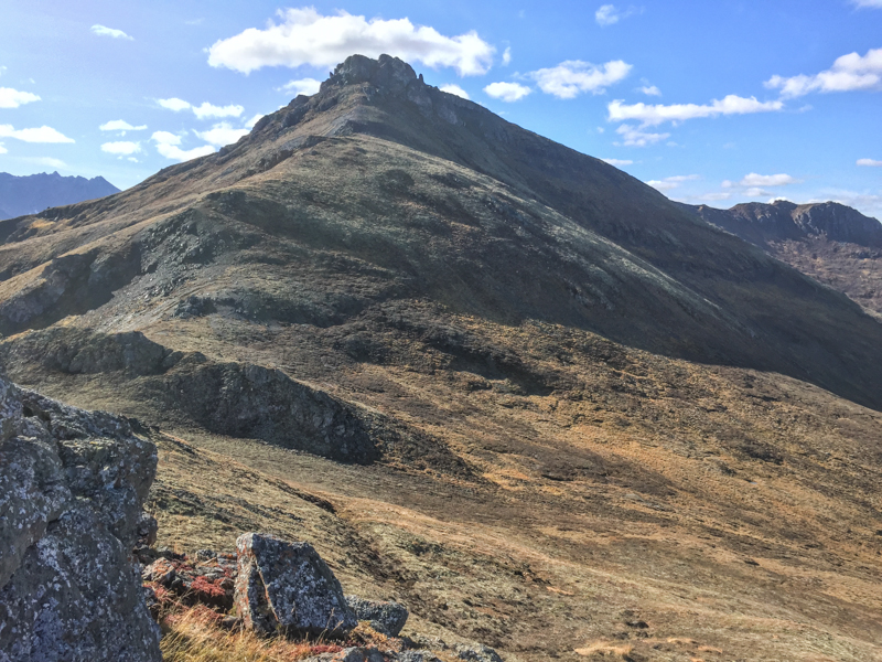 Keep heading southwest across the plateau towards the base of the ridge. You need to be heading towards the right (north) ridge of the mountain. The terrain is quite hummocky at the beginning in the tussocks, which can be hard on the ankles. Hiking poles are a big help for keeping your balance. This route provides the shortest crossing of the tussock field and you avoid crossing any main drainages. There will be one more short section of willows in a low lying area to get through before reaching the base of the mountain.