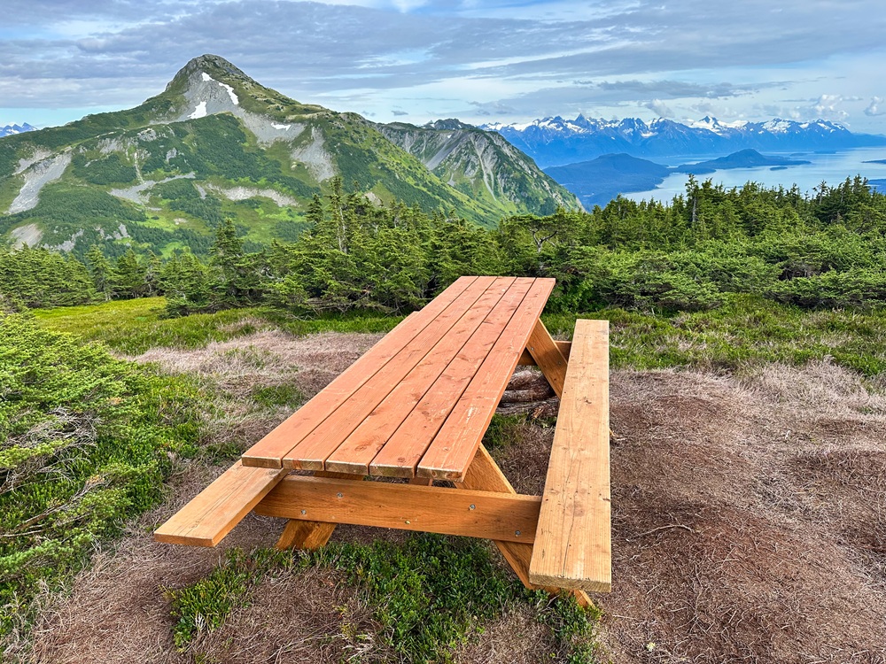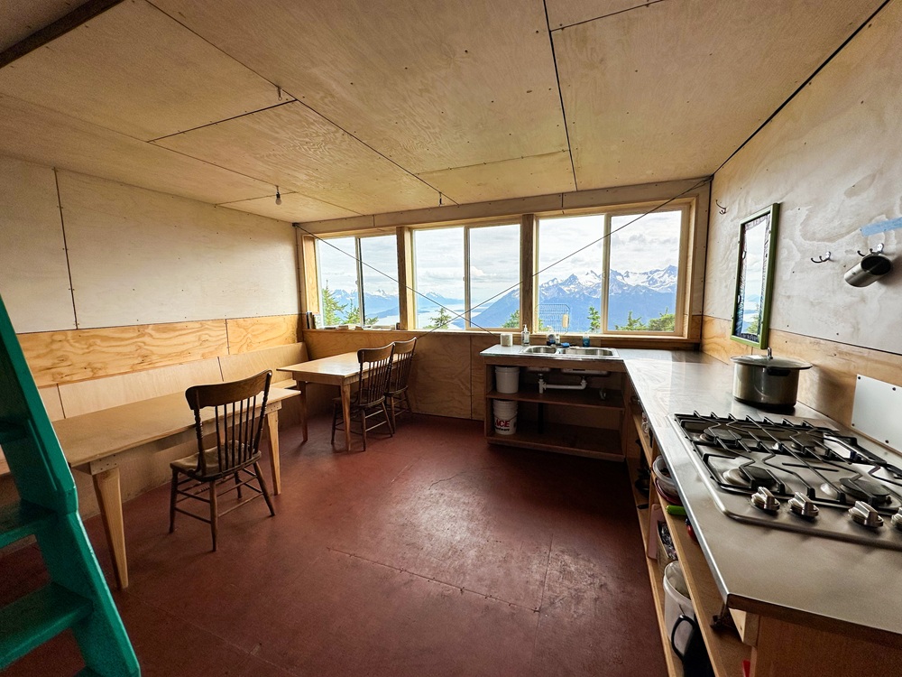 The hut must be booked through the Haines Huts & Trails website. The hut is fairly new (completed in 2024) and the group has been trying out various booking methods, including private and by-the-bunk bookings. The hut can sleep up to 8 adults comfortably (and up to 12 if you max out the space with people and gear). The rental includes an outhouse, a propane heater and cooktop, kitchen dishes and utensils, dish soap and dish cloths, tables and chairs, sleeping platforms (bunks and loft), and a picnic table outside with the most amazing view! Note dogs are not permitted at the hut during the goat kidding season, May 1st to July 15th. Goats in the area are very susceptible to disturbance during that period.