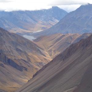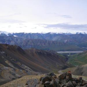 The other recommended side trip is to the west of Bock's Lake, up to a saddle that has a sweeping view of the Duke River and deep into the Kluane Icefields. It is about a 6 km return trip from Bock's Lake and gets to an elevation of 2,348 m. Hike west from the lake, and try to get up on the vegetated areas as they are easier to walk on than the rocky moraines. Climb up the hills and then aim for the base of the ridge in front of you that angles up towards the mountain on your left. You can hike this ridge to the top of the saddle. There is a small snowfield on the other side of the ridge.