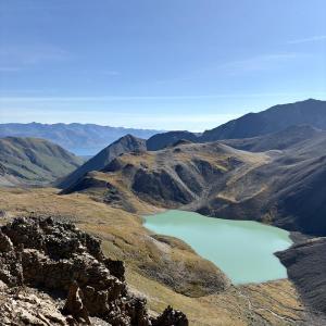 After roughly 10 km, the creek route looks like it starts to split. You want to follow the creek to your right. The route starts to climb and gets narrow at this point. You will eventually reach some islands of vegetation - welcome relief after having to walk on rocks for the past few hours. Keep following the creek bed until you reach a vegetated hillside on your left. On the other side of the hill is Bock's Lake, so you can climb over it at any point now, although it is best to wait until it is a bit more gentle sloping. From the top of the hill, or just a little further, you should see Bock's Lake below you, tucked up against the mountainside.