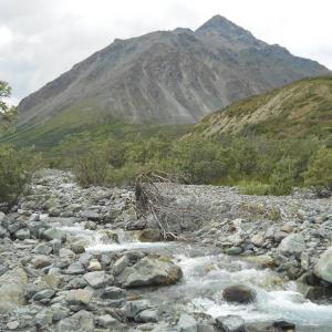 Did this hike this weekend, June 15-16. We hiked to the rock glacier and stayed overnight at the base before making our way to the summit the next day (there is a nice grassy nook on the right side of the river that is fairly sheltered to pitch a tent). Trail conditions were great. Although only the winter route is recorded on this site, it is quite nice to do in the summer. The hike up to the rock glacier along the river bed may call for some stream crossings (mid-calf at its deepest this time of year) or bush whacking. However, tempting it may be to hike up the small hill on the side of the riverbed I would not recommend it – walking through the brush is slow. Once at the rock glacier on the right side of the river bed there is a cairn and flagging tape indicating where to head up to the summit of Decoli. This weekend it was extremely windy (but maybe it is always windy?) heading up on the right side of the mountain helped us to avoid some of the worst gusts of wind. Beautiful view at the top. Highly recommended. Did not see the caribou carcass that the person a month ago saw a grizzly eating, but best to be careful anyways in bear country.