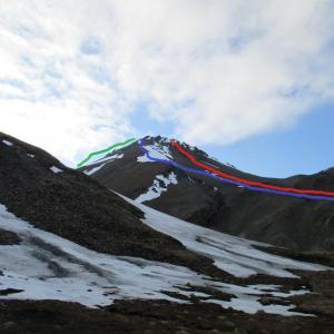 From the moraine, walk up the far scree ridge to the right side of the valley. Follow the ridge all the way to the summit. It is basically scree the whole way up for the most direct route. If you head further up the valley there is a less direct route with less scree. Return the same way.
