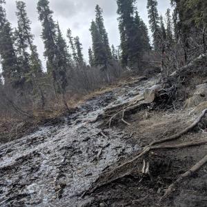 Super muddy still and getting really eroded by the run off. Waterproof hiking boots or shoes a must. On the plus side you don't need to bring water for your dogs still.