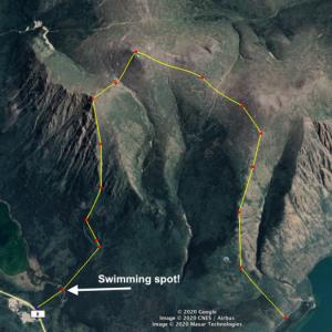 Note that this route follows up the left ridge to the summit, and while not the true summit of Nares Mountain (which lies due north), this route is more accessible and the views are arguably more dramatic from this vantage above the lakes.