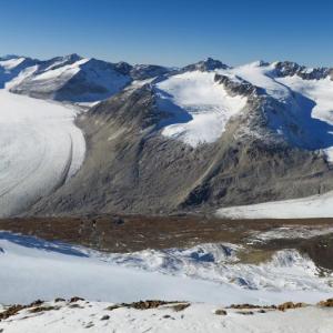 Hiked to Samuel Glacier on Sun Oct. 9th. We stayed on the left side (South) of the meadows after the trail becomes indistinct to avoid the wetter sections but decided to cross to the other side and make it to a further viewpoint closer to Samuel glacier at GR012174. We then continued in a E direction to intersect with the ridge of the mountain right across Samuel Glacier. We worked the easiest line of ascent on the E side of the ridge up scree slopes and made it to the summit at GR021194. This is an incredible viewpoint and a worthy objective in the area. We came down the way we went up and followed different ribs back down the valley, this time staying on the left side (North) to meet up with the old road.