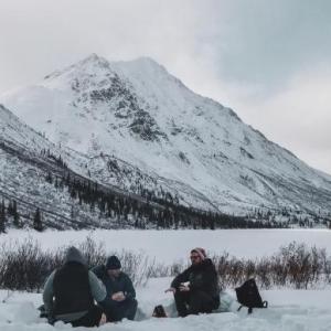 Snowshoeing along the lake with towering mountains overhead.