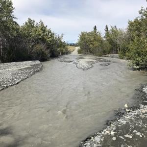 August 17, 2020 - we thought this would be an easy, rainy day trail (after a very rainy long weekend). We were in for a Kluane surprise! The inital two streams were fast moving, knee deep and silty (board walks 1/3 across creek). At the trails junction, water was moving everywhere - regardless, we were familiar with the route, hiking onward. Thunder-egg creek had flowed over its banks. There were many braids of silty water -often knee deep. For a couple of hundred meters, the stream eroded impassable deep trenches of fast moving into the track, easy bushwacking around these sections. The last couple of kilometers were free of water. Has the Thunder-Hen moved her creek? After water levels subside we will know...