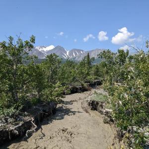 The trail becomes rougher as it travels through an old floodplain of stunted balsam poplar trees.