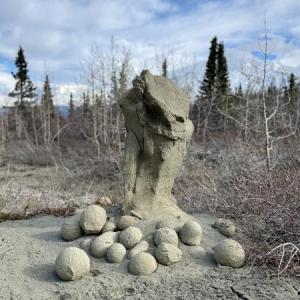 The road ends at a large silt cliff with many good picnic spots to choose from. Thunderegg Creek is through the bushes on the left, but the real attraction is the cliffs themselves as they hold the thundereggs, which are also laying strewn around the base. The views from the cliffs are beautiful looking over the Alsek Valley, Auriol Range and Mount Archibald. Please do not take thundereggs home with you as souvenirs, so that everyone who visits this place in the future can enjoy them. Return the way you came.