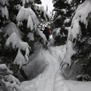 Lots of fresh snow both in town and on the trail. (maybe an understatement) Trail started out with 1.5-2 feet of fresh snow the the Upper Dewey/ Icy Lake cutoff. Approximately 700 (m) walking distance up from the Icy lake cutoff snow depth increases above 2 feet to 5 feet in places to consistently 4-5 feet +. The trail was NOT broken at this time. At 550- 680 meters above sea level, snow depth increases to 6 feet. At this point, there is a clearing and hidden tree wells are frequent. The trail markings also dissapear and we could not find the trail. We recommend at least 10 hours to accomplish the trail to the cabin (until the snowpack consolidates). By November 29th snow was melting in the lower elevations and the freezing level was forecast to rise dramatically.